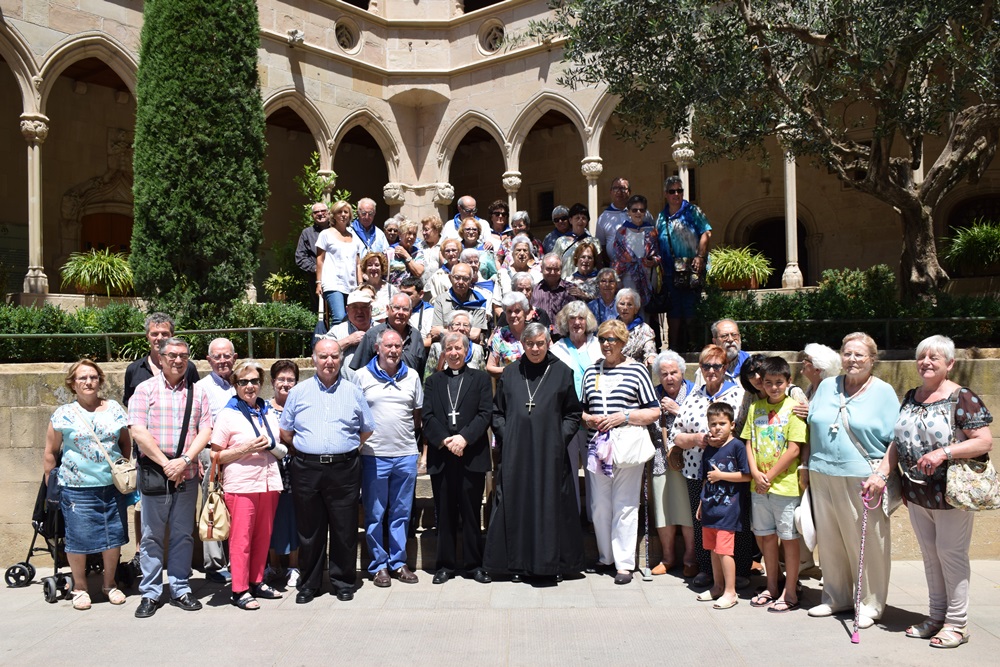 Finalizada la Misa Conventual y tras cantar el Virolai, todos los romeros además de los niños y niñas de la Colonia Qumran con sus monitores, se reunieron en una recepción con el P. Abad Josep M. Solé y nuestro Sr. Obispo. El presidente de la cofradía José Estruch agradeció la acogida de la comunidad benedictina de Montserrat en la Romería de Lleida y la compañía del obispo Salvador. Asimismo se refirió al triple aniversario que este año celebra la Cofradía, por un lado el 135 aniversario de la proclamación de la Virgen de Montserrat como Patrona de Cataluña, que haga el papa León XIII un 11 de septiembre de 1881. por otra parte los también 135 años de su fundación, y el 70 aniversario de su refundación en 1946.
