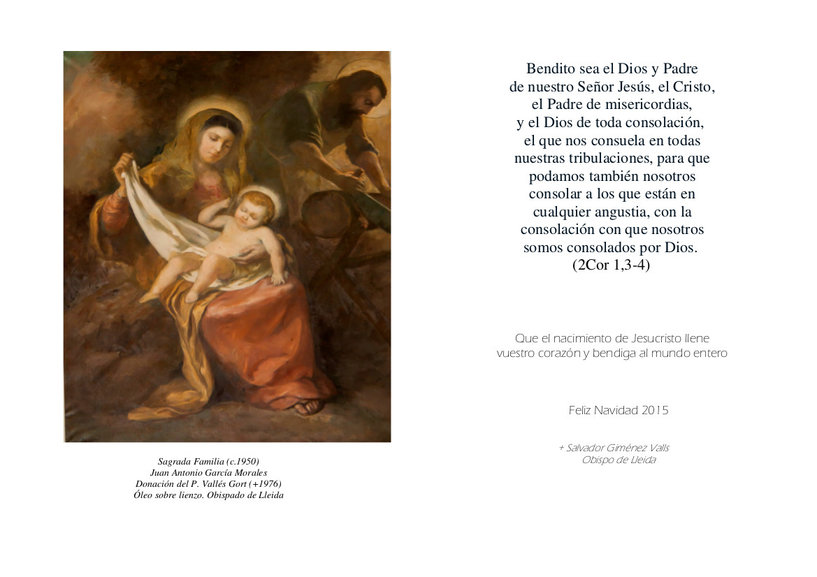 El obispo Salvador felicita la Navidad con esta Sagrada Familia que está expuesta al Obispado de Lleida con el deseo que el "nacimiento de Jesucristo llene vuestro corazón y bendiga el mundo entero".