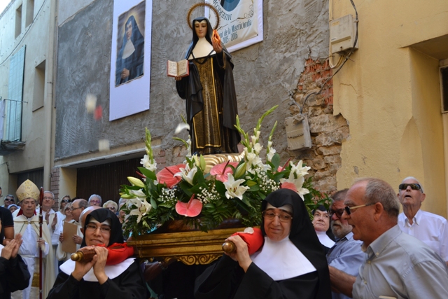 Con la presencia de vecinos de todas las edades, la imagen de la santa llevada por cuatro hermanitas salió de la Casa Asilo a las 10.30 horas y recorrió las calles de este pueblo para celebrar de esta manera solemne esta fecha tan señalada. El obispo Salvador presidió esta procesión que se paró en tres puntos importantes del pueblo, considerado cuna de santos. Primero la comitiva paró en la casa natal de Santa Teresa Jornet, donde nació en 1843, uno de los momentos más emotivos de la fiesta. Después, la procesión también se paró en casa del beato Josep Camí y del padre Palau para continuar hasta la parroquia de Sant Antolí.
