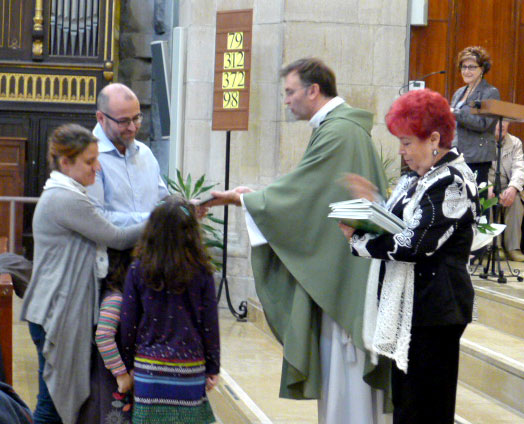 Acabada l'homilia i envoltat pels catequistes, lliurà a cada família el catecisme que a la vegada els pares el lliuraren al seu fill, donant així el començament de la catequesi de primer i segon curs a la parròquia.